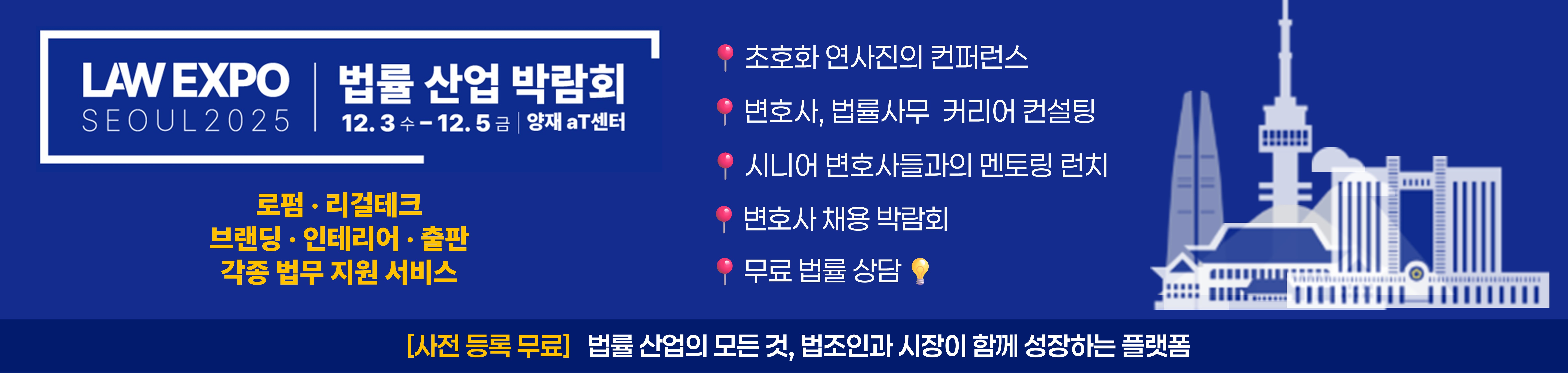 이번 박람회에서는 김·장 법률사무소 등 대형 로펌들은 물론, 리걸테크 기업, 인테리어, 출판사, 브랜드 마케팅, 사무가구, 법무법인 기념품 제작사 등 법률 산업 생태계를 이루는 기업 50여 곳이 부스를 마련했습니다. '해커는 로펌의 무엇을, 어떻게 노리는가' 등 변호사와 로펌 모두가 참고할만한 강연들도 진행됩니다. |